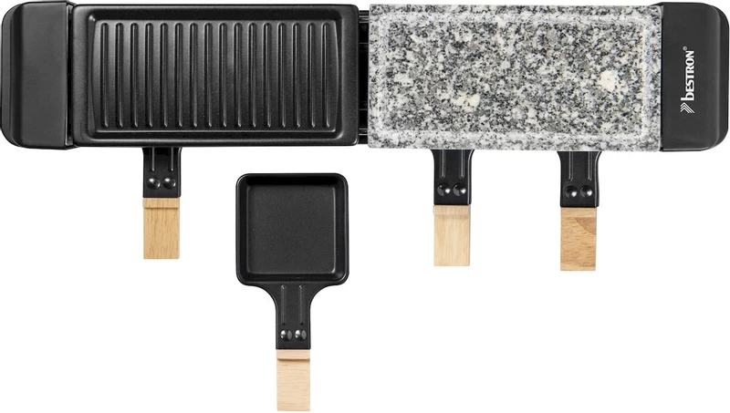 Retteketet, lekker grillen met de Bestron Raclette! Neem lekker plaats aan tafel, want met deze stijlvolle raclette/steengrill met houtdesign ga je veel grillplezier beleven. De gietijzeren grillplaat heeft een antiaanbaklaag met glad en gegroefd oppervlak. Hierdoor bereid je niet alleen een lekker stukje vlees of vis, maar je bakt ook eenvoudig een eitje op de plaat.