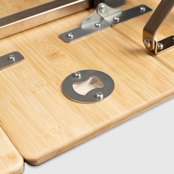 Een inklapbare campingtafel met een hitte- en vochtbestendig blad van naturel bamboe. De Zempire Kitpac V2 Campingtafel groot is superhandig! Door de verstelbare poten kan de tafel op salontafelhoogte worden gebruikt en door de micro-instelbare voetjes staat ‘ie zelfs op oneffen oppervlakken recht! Bovendien heeft de campingtafel een oppervlakte van 100 x 65 x 48 cm en heeft ‘ie een aluminium frame met een vierkant stevig, lichtgewicht en roestbestendig profiel. Daarnaast heeft de campingtafel een ingebouwde flesopener, borrelen maar!